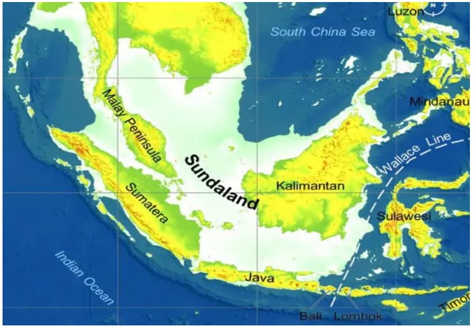 KITAINDONESIASATU.COM – Sundaland adalah daratan luas yang menyatukan pulau-pulau di Indonesia bagian barat seperti Sumatera, Jawa, dan Kalimantan, serta Semenanjung Malaya, yang terbentuk ketika permukaan air laut turun pada zaman es terakhir (periode Glasial terakhir) sekitar 1800 tahun yang lalu, permukaan air laut turun hingga 120 meter. Masa ini ditandai dengan suhu yang lebih dingin dan es yang menutupi banyak wilayah Bumi. Penurunan muka air laut ini memungkinkan manusia dan hewan untuk berpindah-pindah dari satu tempat ke tempat lain tanpa harus menyeberangi lautan.