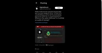 KITAINDONESIASATU.COM – Jagat maya diguncang pengakuan mengejutkan dari akun anonim DigitalGhostt yang mengklaim telah meretas data pribadi milik 4,6 juta warga Jawa Barat. Pengumuman itu diposting di platform X (Twitter) pada Rabu, 10 Juli 2025, pukul 16.33 WIB.