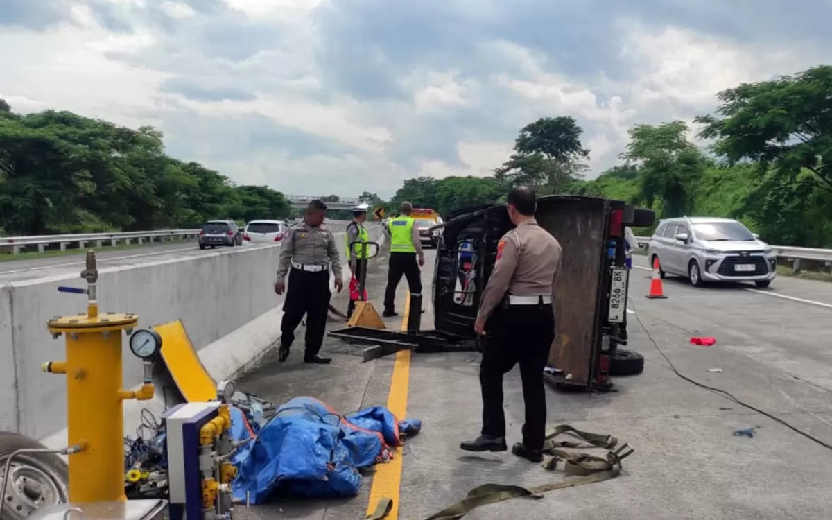 Kondisi tersebut membuat pikap oleng ke kanan, menghantam pembatas jalan tengah, lalu terguling di badan tol.