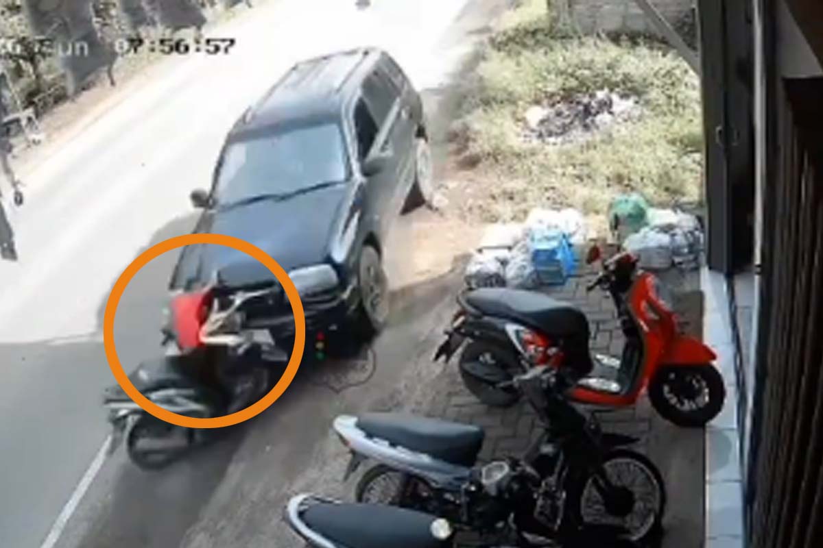 Tiba-tiba dari ara berlawanan atau dari arah Selatan saat sepeda motor diparkir sebuah mobil Suzuki Escudo melaju dari arah tertentu dengan kecepatan tinggi.