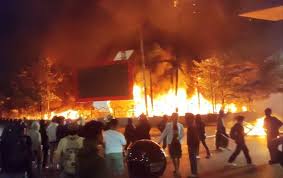 Informasi yang dihimpun massa yang marah berhasil menjebol gerbang dan merangsek masuk ke dalam gedung. Mereka diduga melemparkan bom molotov, yang dengan cepat menyulut api hingga melahap seluruh bangunan. Api yang membesar membuat sejumlah staf dan pegawai yang berada di dalam terjebak.