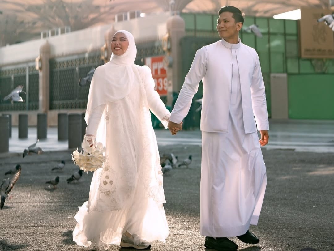 Dalam unggahannya, Dara tampil anggun dengan gaun serba putih, serasi dengan Rehan yang mengenakan gamis senada. Pasangan ini terlihat memamerkan senyum bahagia dengan latar belakang pemandangan indah Kota Madinah.