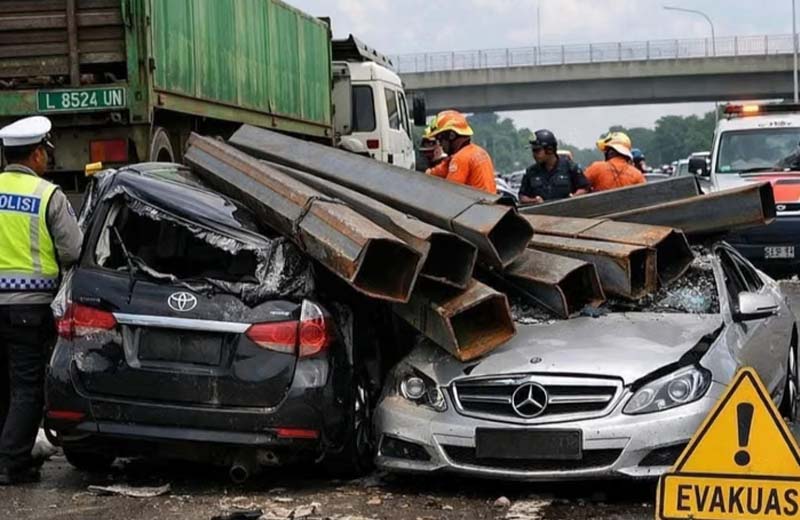 Kecelakaan sendiri melibatkan truk trailer L 8524 UN bermuatan gelondongan besi yang menimpa dua kendaraan pribadi mobil SUV B 2826 TYL dan Sendan B 212 DHM di dekatnya hingga kedua mobil ringsek parah menewaskan dan meluka penumpang di dalamnya.