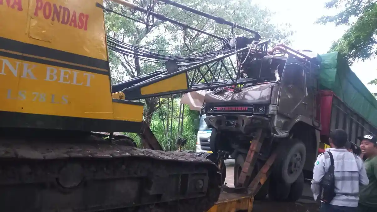 Karena jarak yang terlalu dekat dan kurangnya konsentrasi, truk dari belakang akhirnya menabrak kendaraan bermuatan crane tersebut.