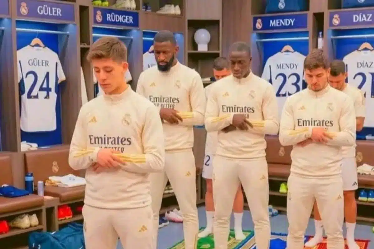 “Pemain Real Madrid mendapatkan momen penuh kekuatan iman — mereka berdoa bersama di ruang ganti sebelum pertandingan Liga Champions UEFA. Arda Güler, Antonio Rüdiger, Ferland Mendy, dan Brahim Díaz berdiri tanpa alas kaki di atas sajadah, mengenakan seragam latihan lengkap mereka,” tulis unggahan itu. **