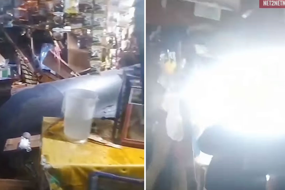 Dari video yang beredar, pipa besi raksasa itu terlihat sudah berada di dalam kios, membuat atap kios hancur total.