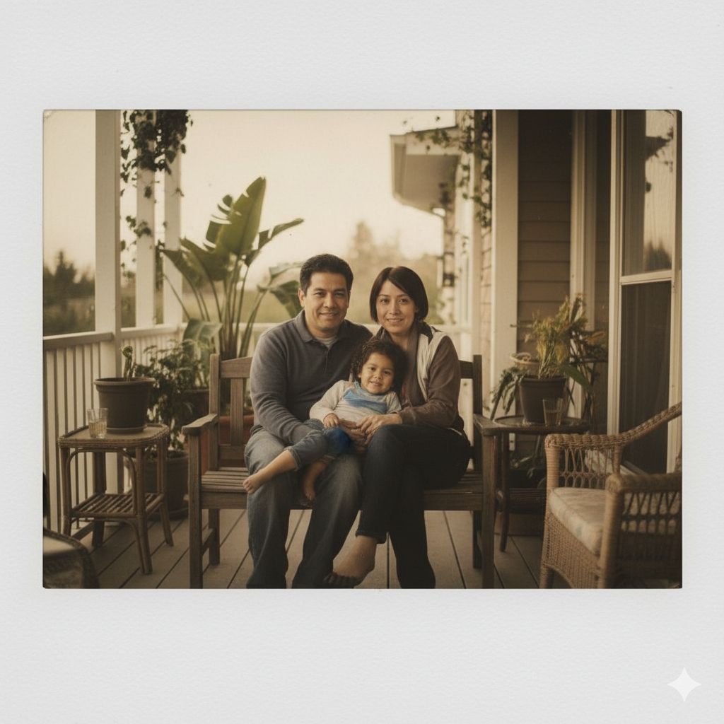 4. Perbaiki foto ini menjadi foto studio keluarga bertema vintage, pakaian retro tahun 70-an, warna foto agak sepia, dengan kursi kayu klasik. Ukuran foto 16X9 landscape.