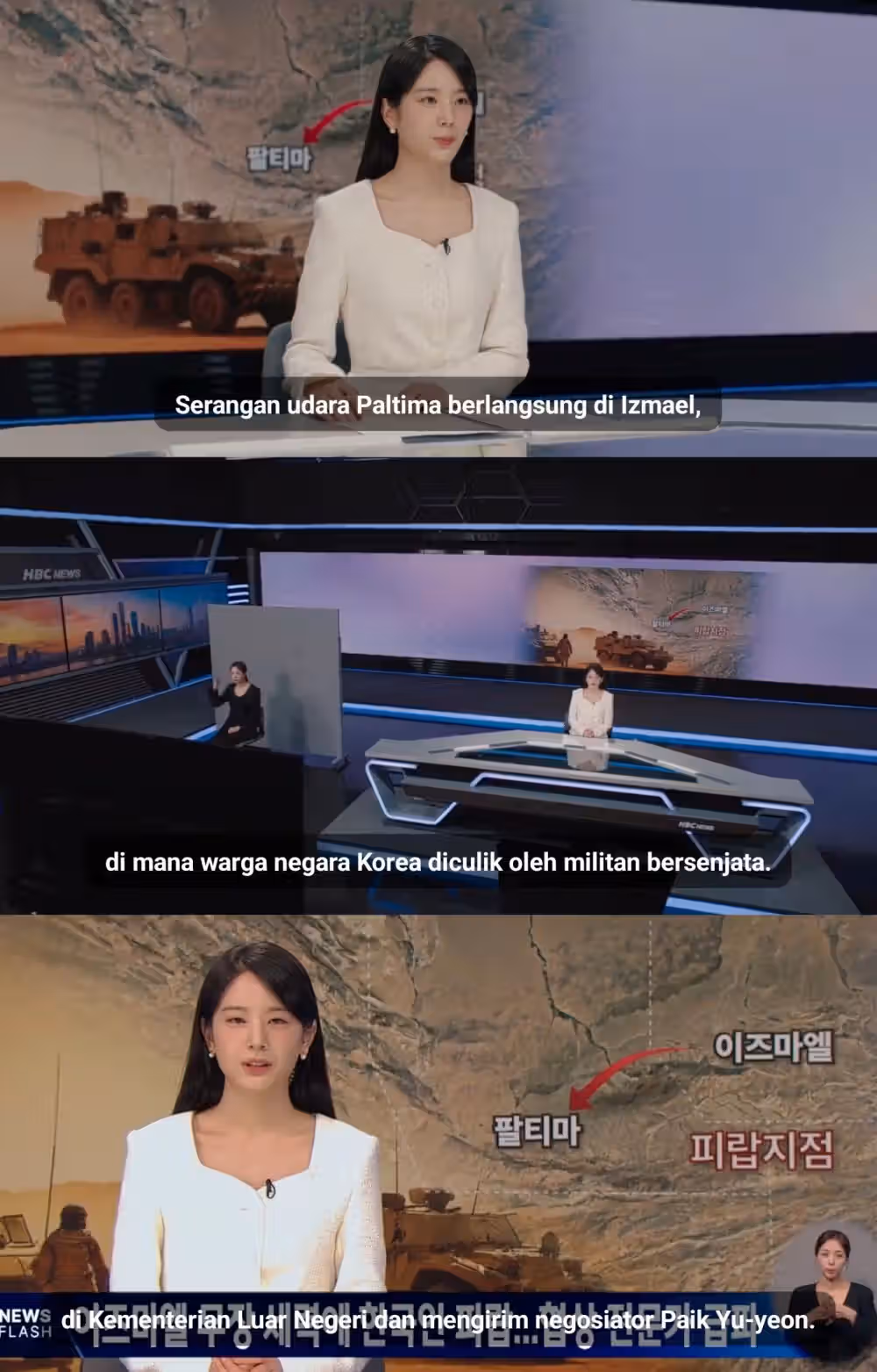 “Serangan udara Paltima berlangsung di Izmael, di mana warga negara Korea diculik oleh militan bersenjata. Sebagai tanggapan, pemerintah mendirikan Markas Besar Perlindungan di Kementerian Luar Negeri dan mengirim negosiator Baek Yu Yeon,” ujar Na You Ri.