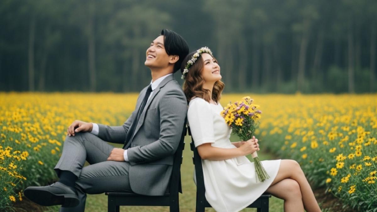 – Pemandangan Padang Bunga: Foto pasangan romantis berada di padang bunga yang luas, penuh dengan bunga berwarna-warni. Mereka berdiri berdekatan sambil tertawa lepas, menatap satu sama lain dengan penuh kebahagiaan. Cahaya matahari sore yang hangat menambah nuansa cerah dan romantis. Angin lembut membuat kelopak bunga sedikit bergoyang, menciptakan suasana alami yang indah. Nuansa foto penuh keceriaan dan cinta, seperti adegan romantis dalam film atau pemotretan prewedding estetik. Gaya fotografi realistis, high-resolution, cinematic lighting, golder hour, bokeh background.