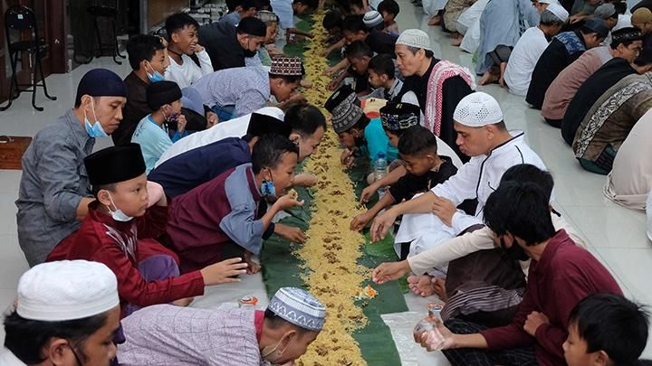 Setiap orang mengambil makanan satu per satu. Tidak boleh mendahului secara serakah atau mengambil terlalu banyak.