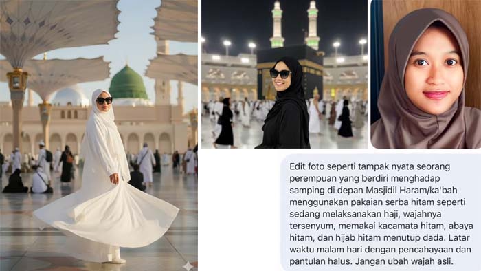 KITAINDONESIASATU.COM – Unggahan mejeng di depan Kabah dan Masjid Nabawi belakangan viral di sosial media Tik-tok, dibuat secara sederhana dari prompt Gemini AI.