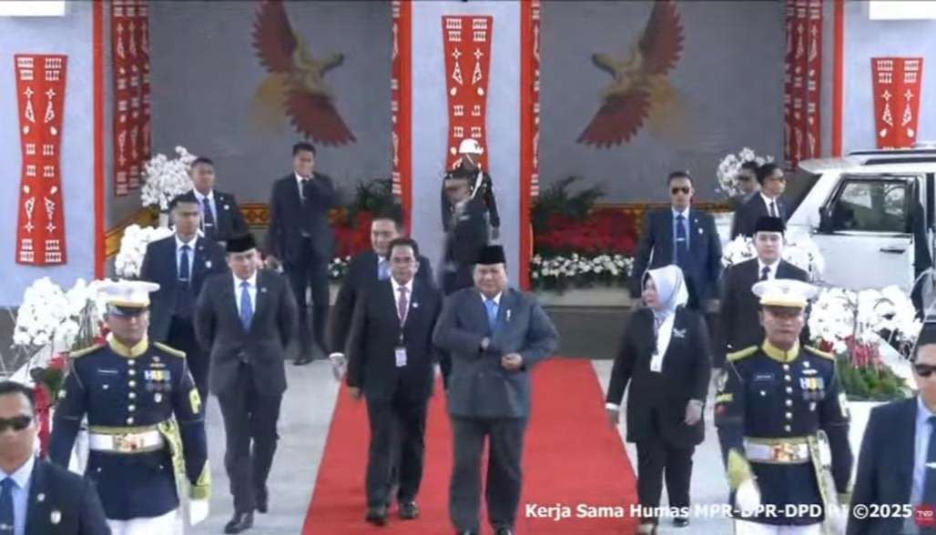 Sejak tiba di Gedung DPR/MPR RI pukul 08.54 WIB, perhatian publik langsung tertuju pada penampilannya—setelan jas abu-abu rapi, peci hitam khas, dan dasi biru muda yang mencuri perhatian.