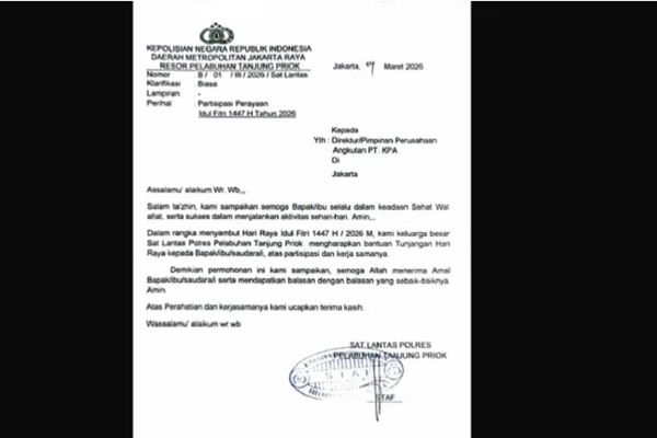 Sebelumnya, publik dibuat heboh setelah foto surat berkop Polres Pelabuhan Tanjung Priok dengan nomor B/01/III/2026/Sat Lantas beredar luas di media sosial. Dalam surat bertanggal 4 Maret 2026 itu tertulis permohonan Partisipasi Perayaan Idul Fitri 1447 H/2026 yang ditujukan kepada pimpinan perusahaan angkutan PT KPA.