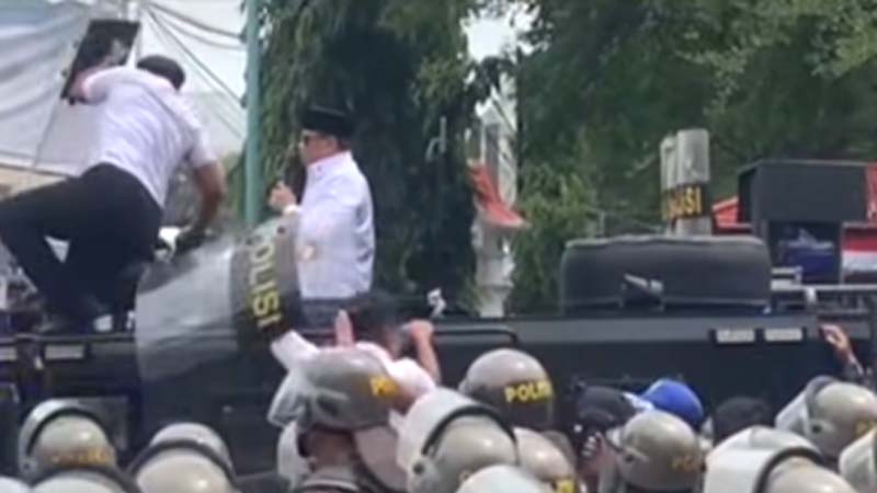 Dalam kesempatan itu Bupati Sadewo muncul dari dalam mobil ratis Brimob sambil memegang microfon dengan perlindungan tameng dari para pengawalnya.