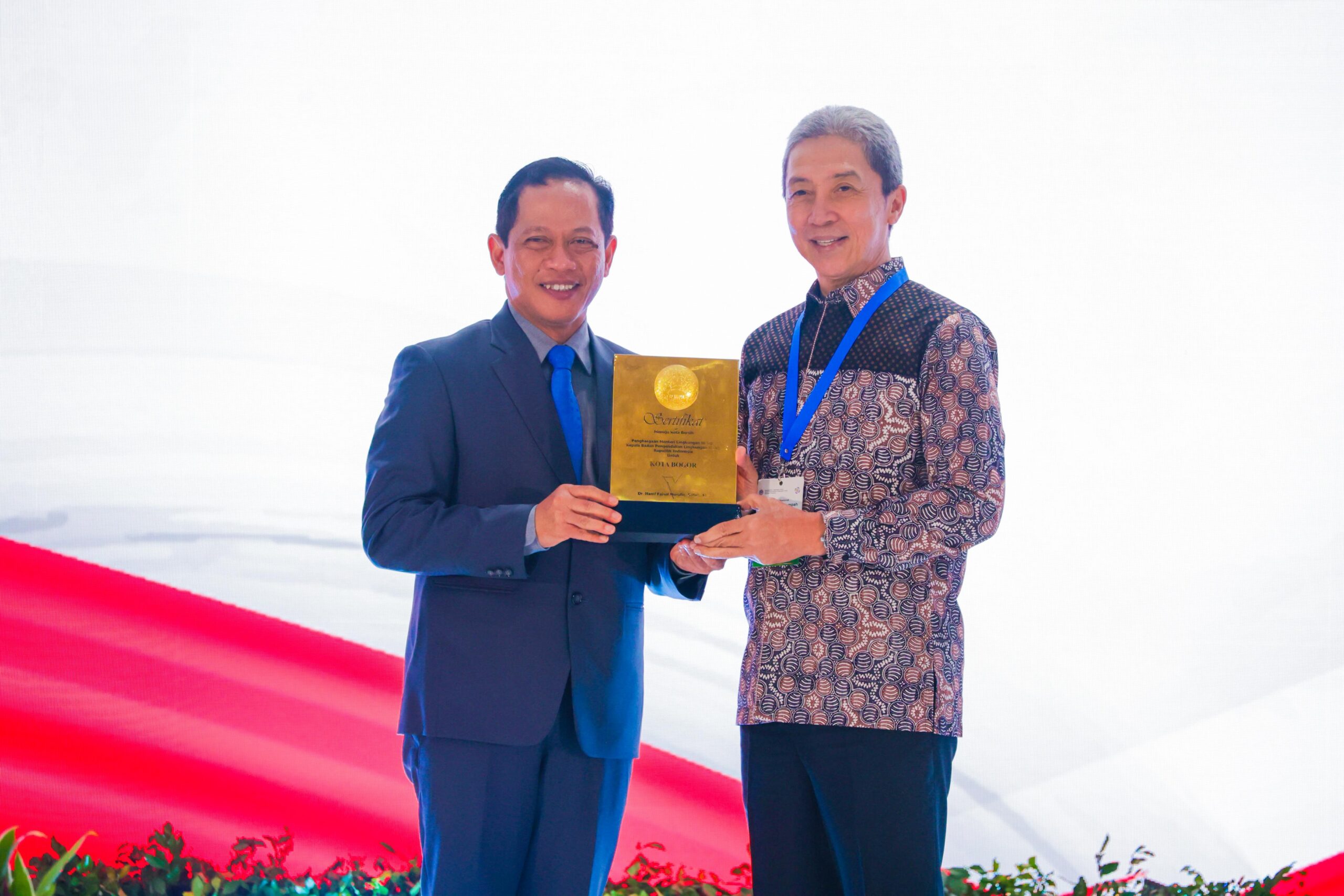 Menteri Lingkungan Hidup, Hanif Faisol Nurofiq (Jas), bersama Wali Kota Bogor, Dedie A. Rachim (Batik), menunjukkan penghargaan Predikat Kota Menuju Bersih yang diraih Kota Bogor pada Rakornas Pengelolaan Sampah 2026 di Balai Kartini. (Kis/ist)