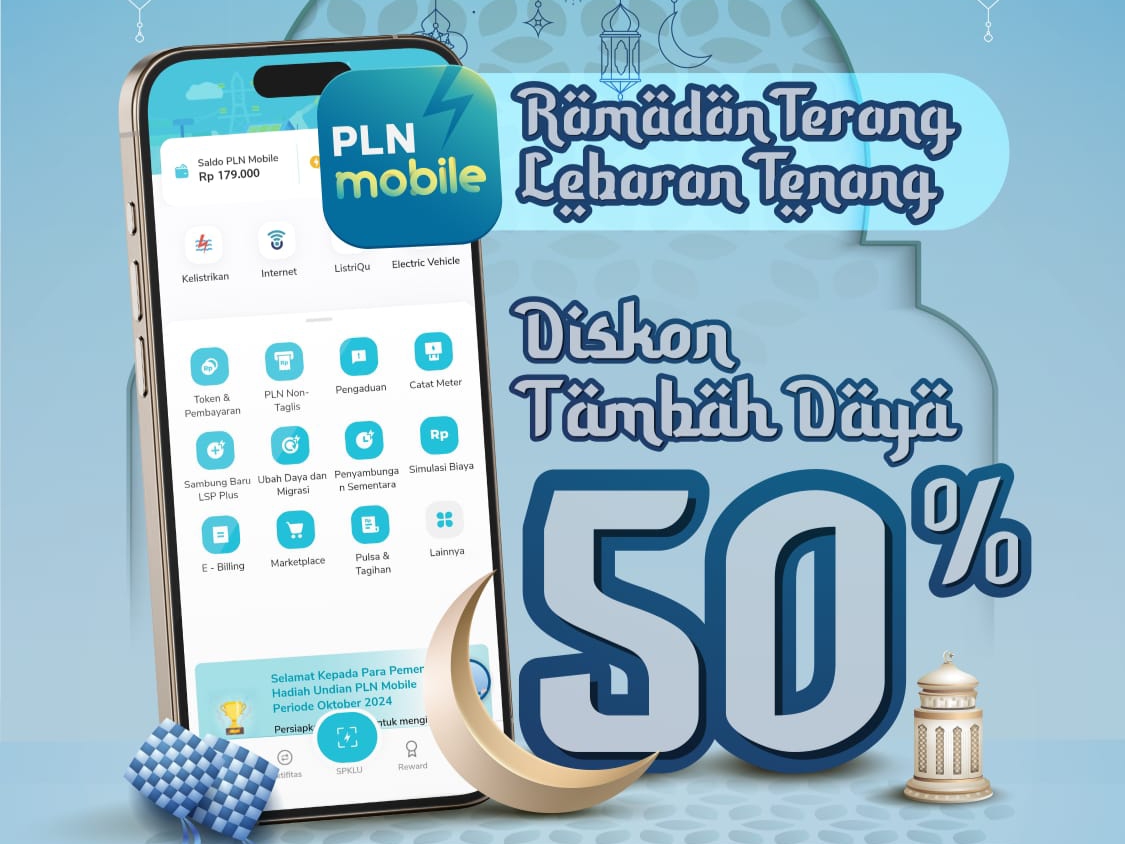 KITAINDONESIASATU.COM- Menyambut Bulan Ramdhan 1447 H, PT PLN (Persero) menghadirkan program promo “Ramadhan Terang Lebaran Tenang” berupa diskon 50% biaya tambah daya listrik bagi pelanggan 1 fasa dengan daya 450 VA hingga 5.500 VA. Program ini berlaku mulai 25 Februari hingga 10 Maret 2026 dan dapat diakses secara mudah melalui aplikasi PLN Mobile.