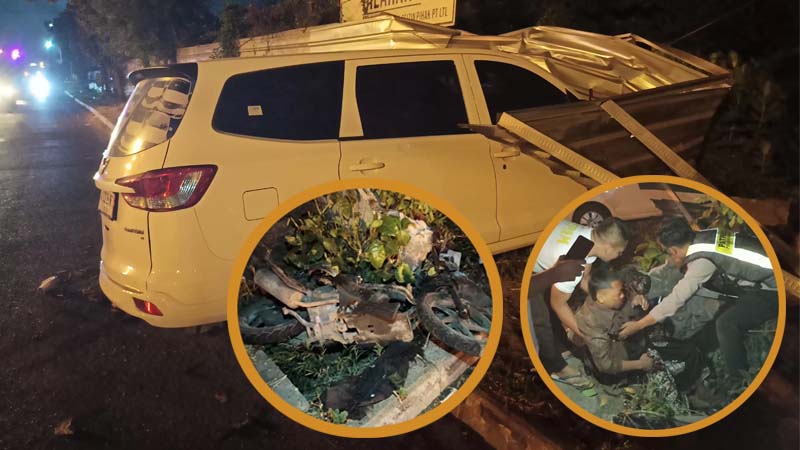 Akibat kecelakaan iu mobil mengalami ringsek bagian depan sementara sepeda motor korban hancur nyaris tak terbentuk dan tergeletak di pinggir jalan hingga naik ke trotoar pembatas jalan.
