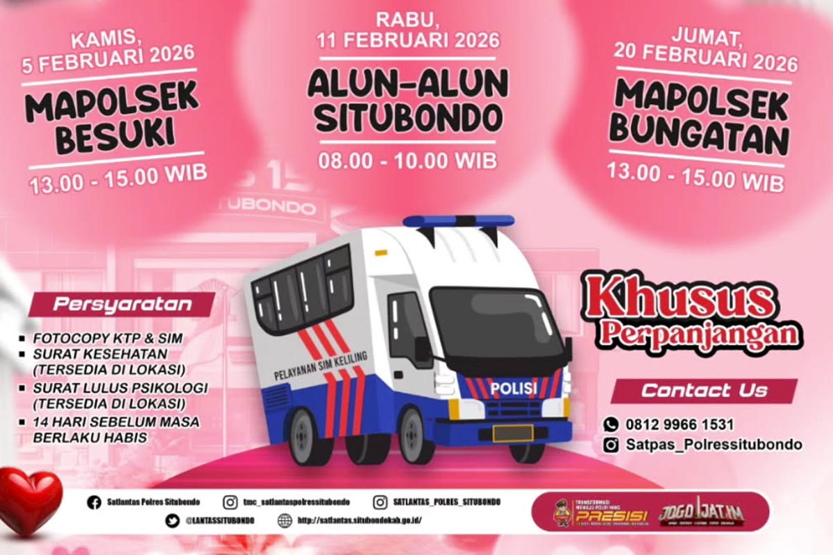 KITAINDONESIASATU.COM – Satlantas Polres Situbondo memberikan layanan perpanjangan Surat Izin Mengemudi (SIM) Keliling di sejumlah lokasi wilayah Situbondo Februari 2026.