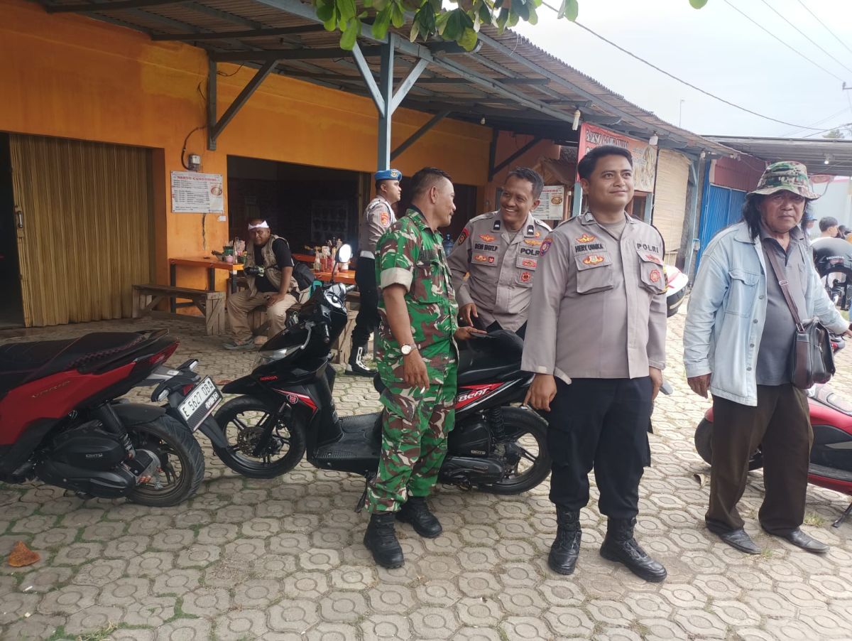 Personel gabungan TNI–Polri terlihat aktif menyapa masyarakat, menyampaikan pesan damai, dan mengajak warga ikut menjaga suasana kondusif.
