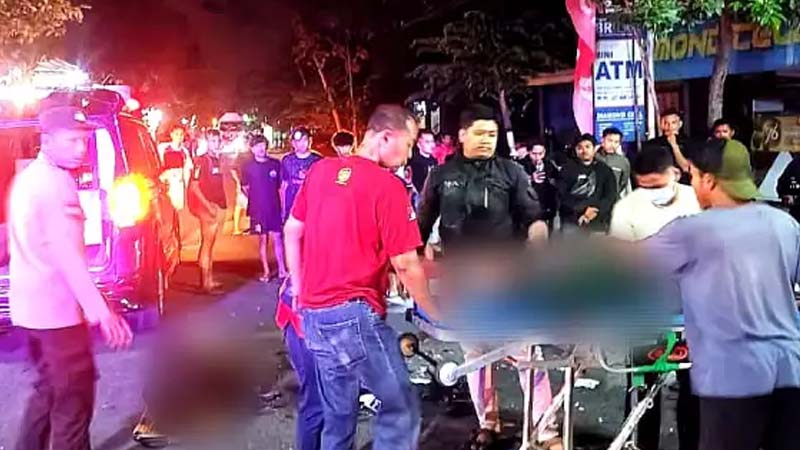 Kedua pengendara sepeda motor Honda Beat AE 6671 WI dikendarai Ahmad dan Satrian diketahui seorang pria tidak diketahui identitasnya saling bertabrakan adu banteng hingga keduanya tewas di tempat kejadian kecelakaan.