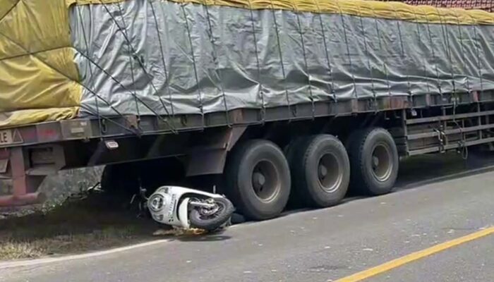 Truk Trailer Mundur Gagal Menanjak, Remaja Ngawi Selamat Sepeda Motor Mengganjal Roda Belakang